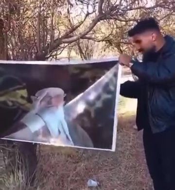 It shows him holding a large poster of Iran’s highest leader,Ali Khamenei,overlaid with the voice of the last Shah,Mohammad Reza Pahlavi,who fled to exile during the Islamic Revolution.
