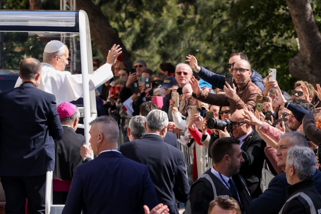 Pope Leo XIV waves from the popemobile as he leaves the Prince’s Palace (Picture: EPA)