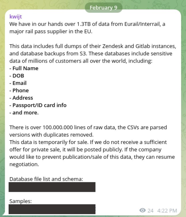 A sample dataset,which does not include people’s data,was also copied to Telegram,popular among drug dealers and extremists,Eurail found.